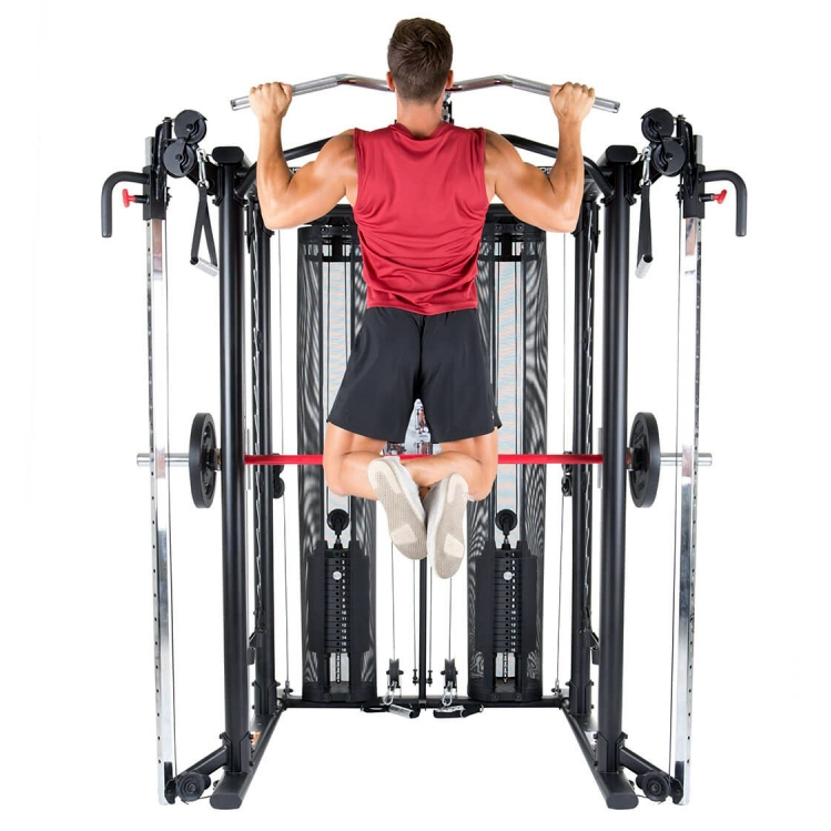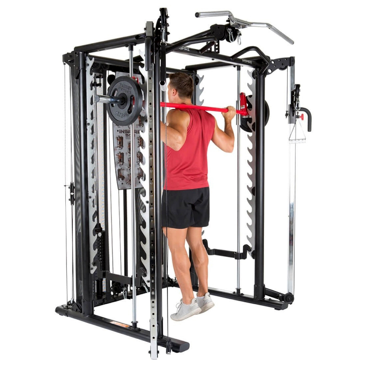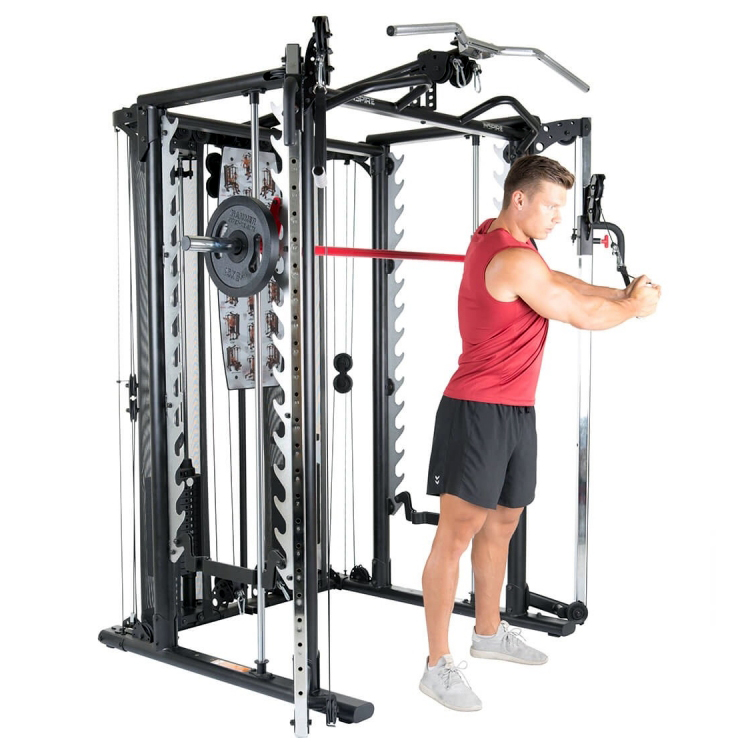 Движение грифа плавно за счет специальных направляющим, по которым он проходит. Благодаря такому свойству, абсолютно исключена потеря равновесия во время занятий, что убирает необходимость прибегать к помощи страхующего. Используйте блины или весовые стеки в качестве отягощения для усиления эффекта. С таким помощником возможно для выполнения просто нереальное количество упражнений: жимы под разными углами, тяга со штангой, приседания, сведение рук перед собой, тренировки икроножных мышц, становая тяга. Перечислять можно бесконечно.