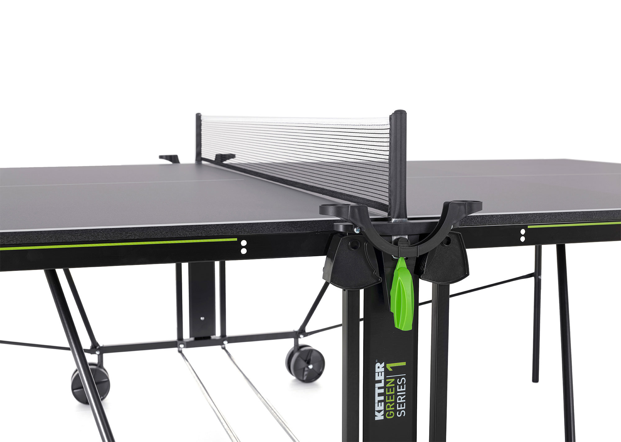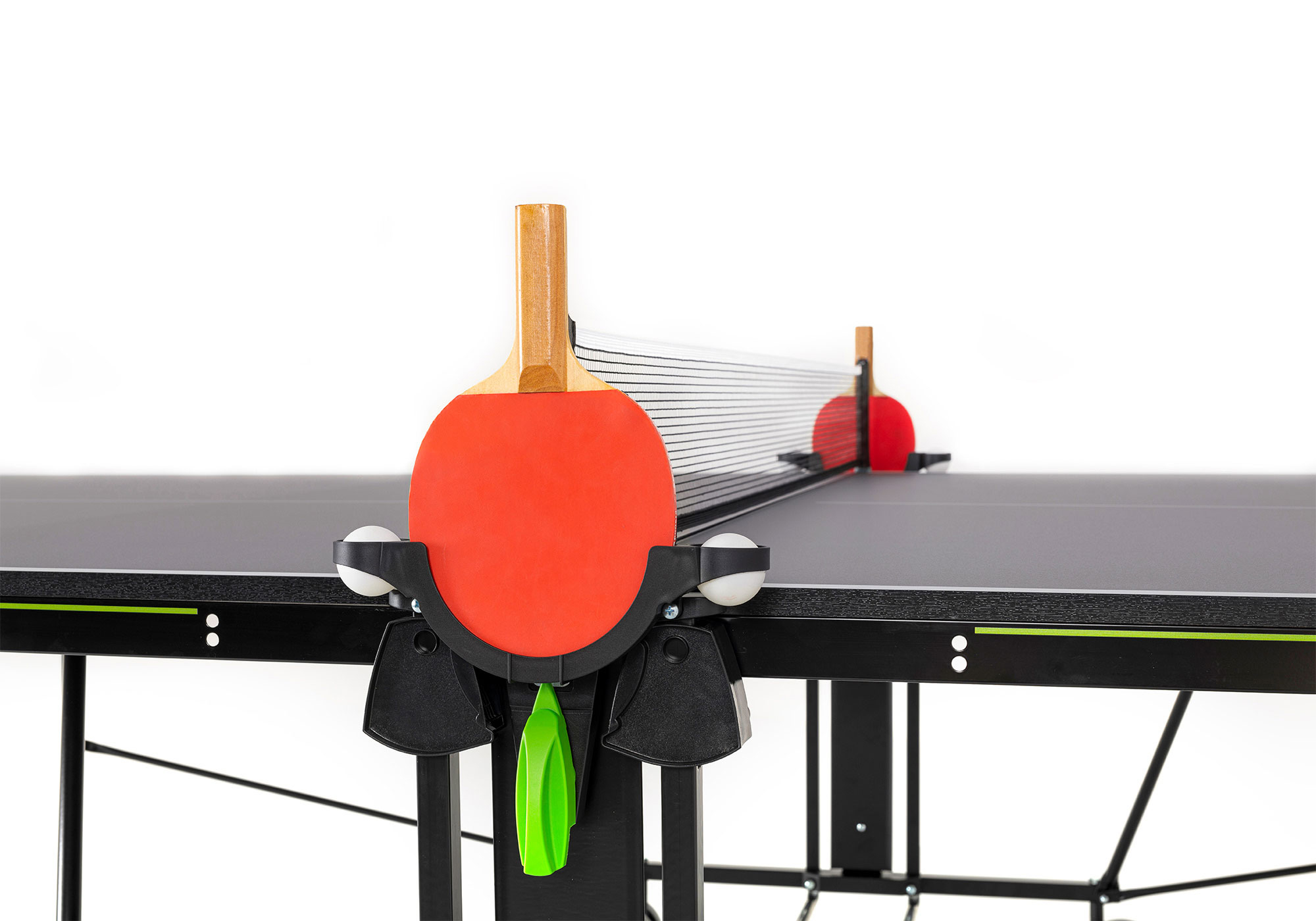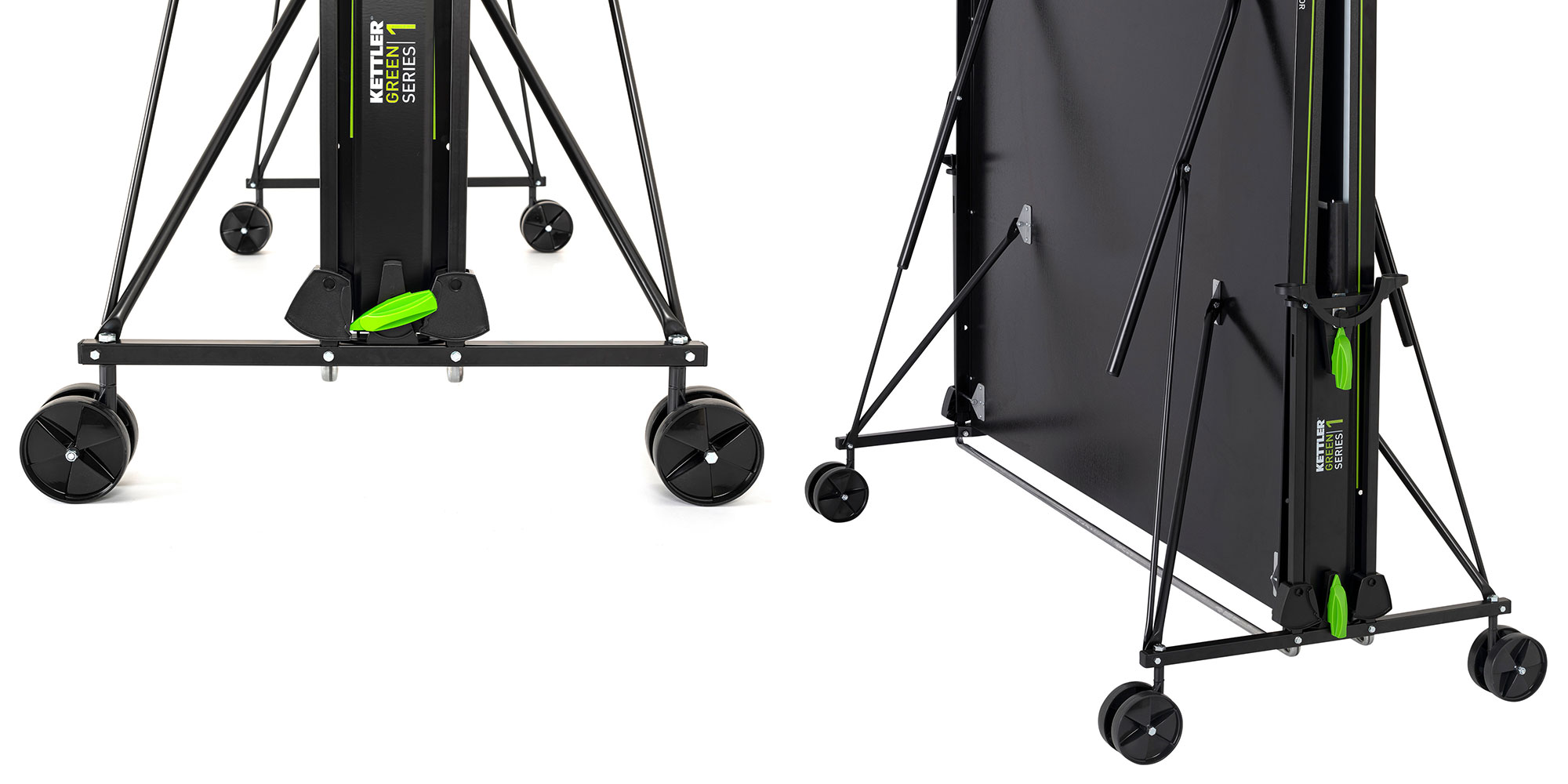 Основание - круглая стальная труба 36 мм с порошковым покрытием. 2 держателя для ракеток и мячей по бокам (ракетки и мячи в комплект не входят). 4 двойных поворотных колеса. Конструкция устойчива к вибрации. Поворотная система с замком для складывания теннисного стола.