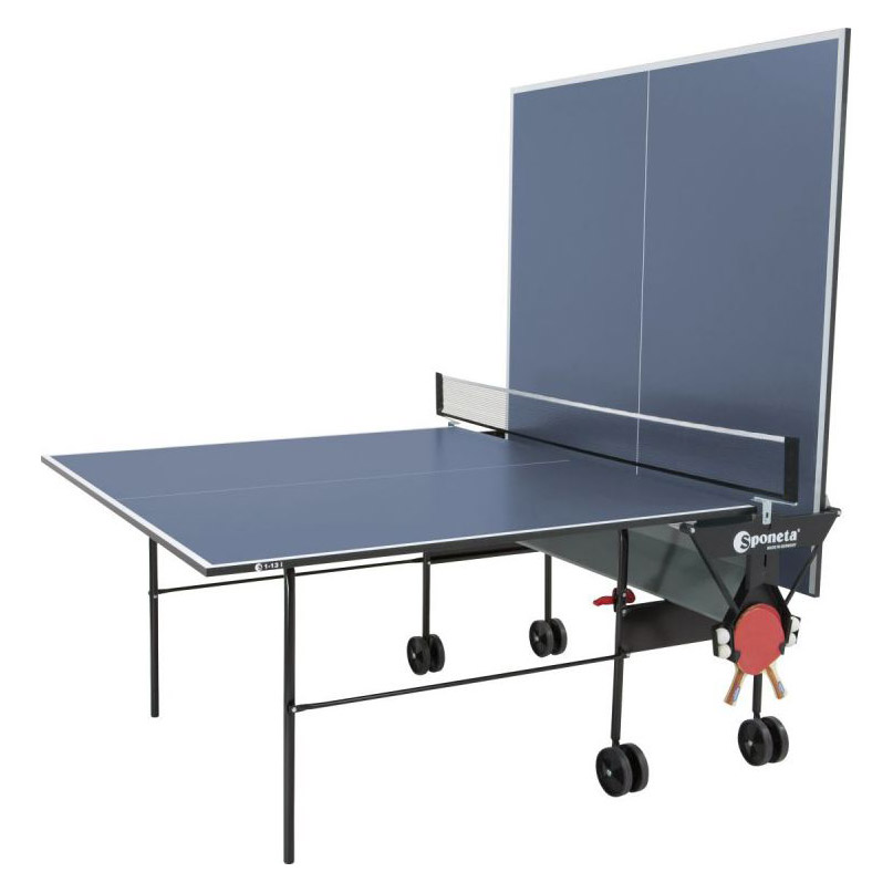 Стол теннисный Sponeta S1-13i - отличный складной теннисный стол для игры в закрытых помещениях. Каждый, кто играл в настольный теннис, никогда не забудет увлекательности и азарта этой игры. А сколько радости, бодрости и положительных эмоций приносит этот простой и доступный вид прикладной игры. В качестве материала для стола используется специально обработанная древесностружечная плита (ДСП) толщиной 19 мм, что обеспечивает очень хороший отскок мяча во время игры. На ДСП нанесено специальное антибликовое покрытие. Стол легко перемещается на 4-х колесах диаметром 125 мм, два колеса - маневренные. Конструкция стола позволяет тренироваться в одиночку.