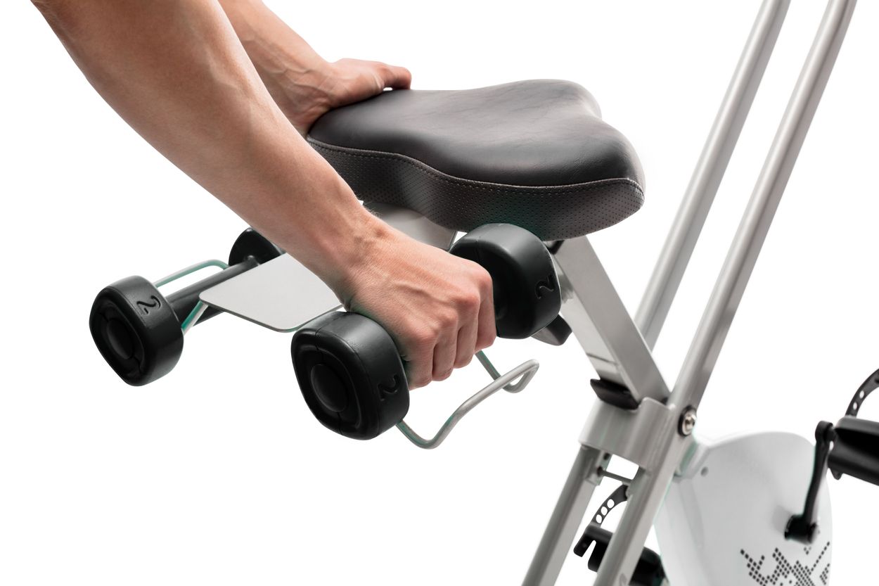 Велотренажер-трансформер ProForm X-Bike Elite представляет собой домашний кардиотренажер для фитнеса, предназначенный для тех людей, которые хотят сэкономить как можно больше места. Это очень легкий, складной тренажер с транспортировочными колесами, что позволит без проблем переместить его и хранить после тренировки дома. Он предназначен не только для ваших ног. Устройте себе тренировку всего тела во время езды с помощью прилагаемой пары гантелей 2х1 кг. Это идеальный вес гантелей для упражнений на верхнюю часть тела во время езды на велосипеде.