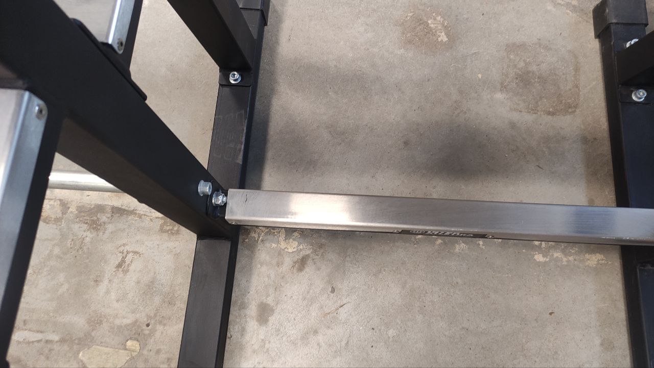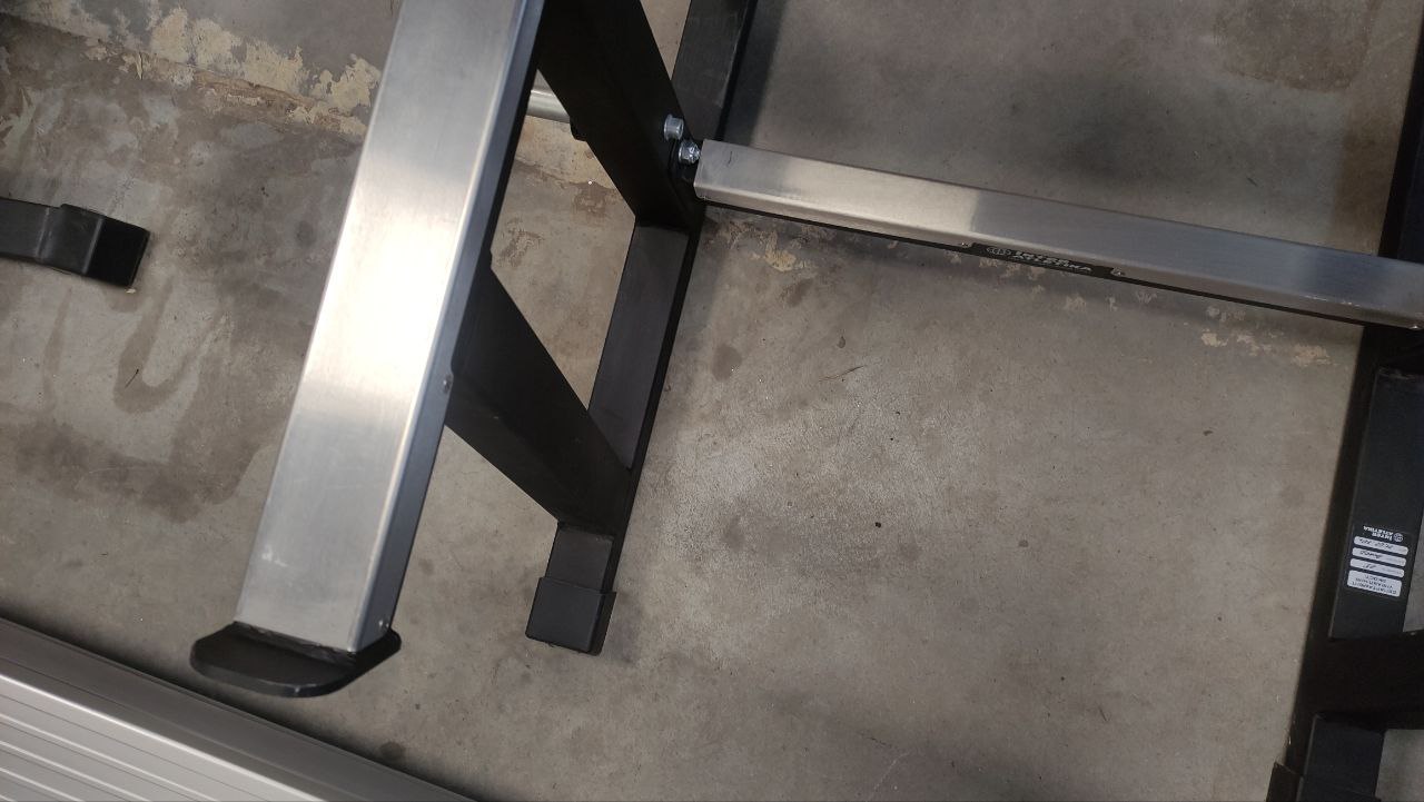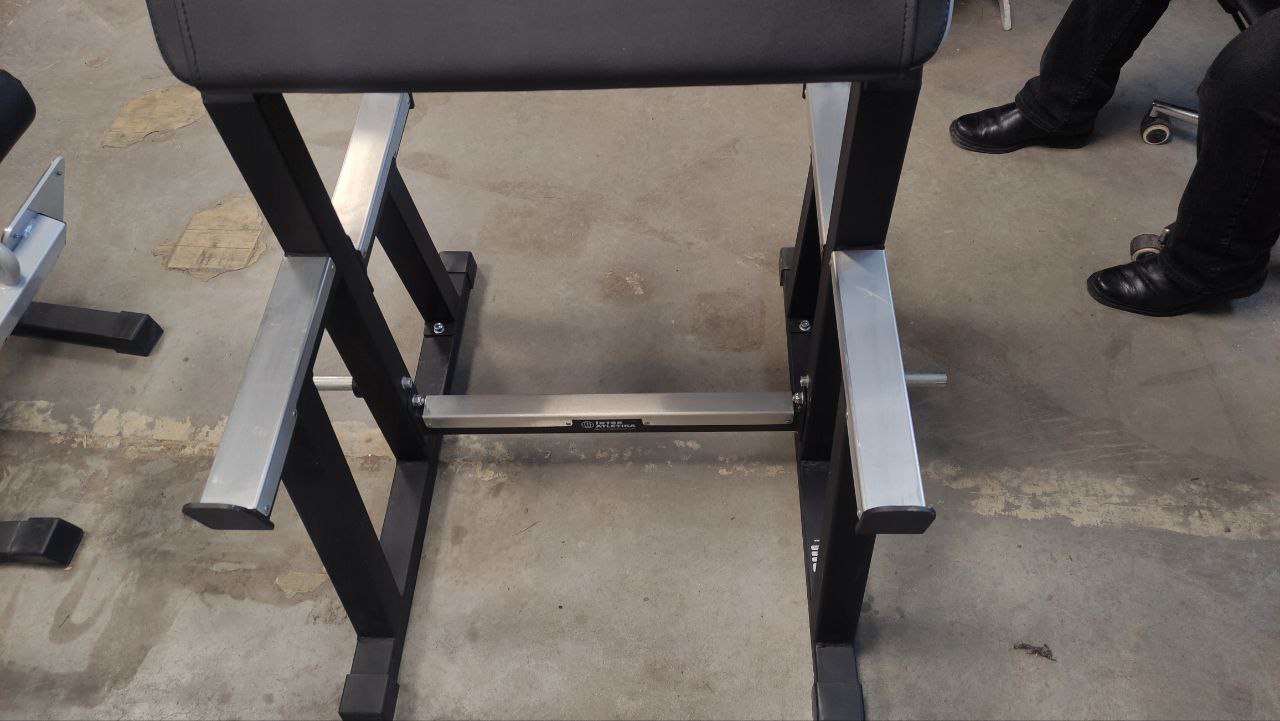 Міцна і надійна конструкція має основний профіль труби 60х60х2,5 мм та посиленні метизи, тому розрахована на інтенсивне навантаження. Максимальна вага користувача – 150 кг. Два фіксатори для штанги розташовані з різних сторін і знаходяться в різних положеннях. Устаткування додатково оснащено дискотримачами. Оббивка виготовляється з високоякісної штучної шкіри, наповнювачем служить двошаровий пінополіуретан – матеріал стійкий до усадки, не піддається деформації. Виріб покритий порошковою емаллю, яка наноситься способом електростатичного напилення.