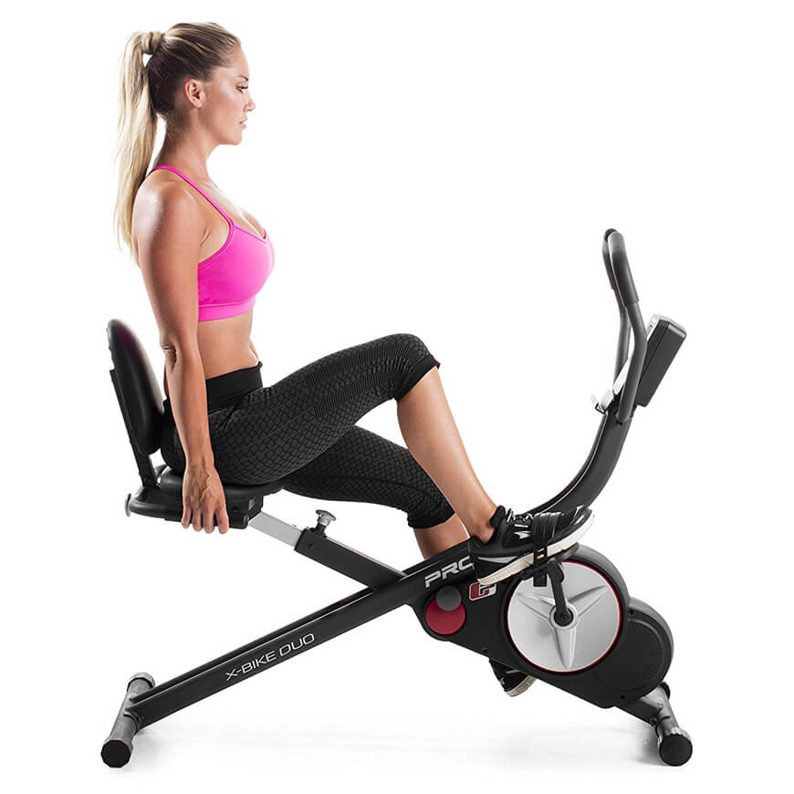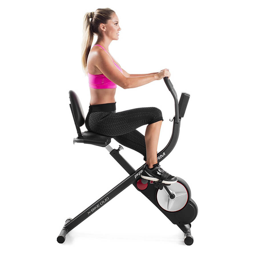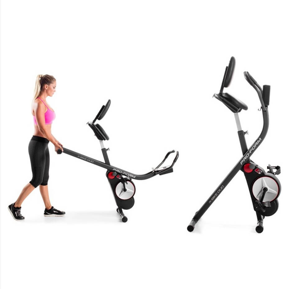 Велотренажер-трансформер ProForm X-Bike Duo з магнітною системою навантаження має унікальні формами, незвичайним дизайном і стійкою конструкцією. Велотренажер імітує їзду на мотоциклі, замінює біг, особливо в погану погоду. Рівень пульсу визначається датчикам на рукоятках. Незвичайна конструкція і загальний невелику вагу сприяють швидкій транспортуванні тренажера. Тренажер завоював визнання серед жінок і чоловіків різного віку. Монітор велоергометра працює від батарейок, а часті вправи допомагають підтримувати хорошу фізичну форму, економити час при відвідуванні фітнес центрів.